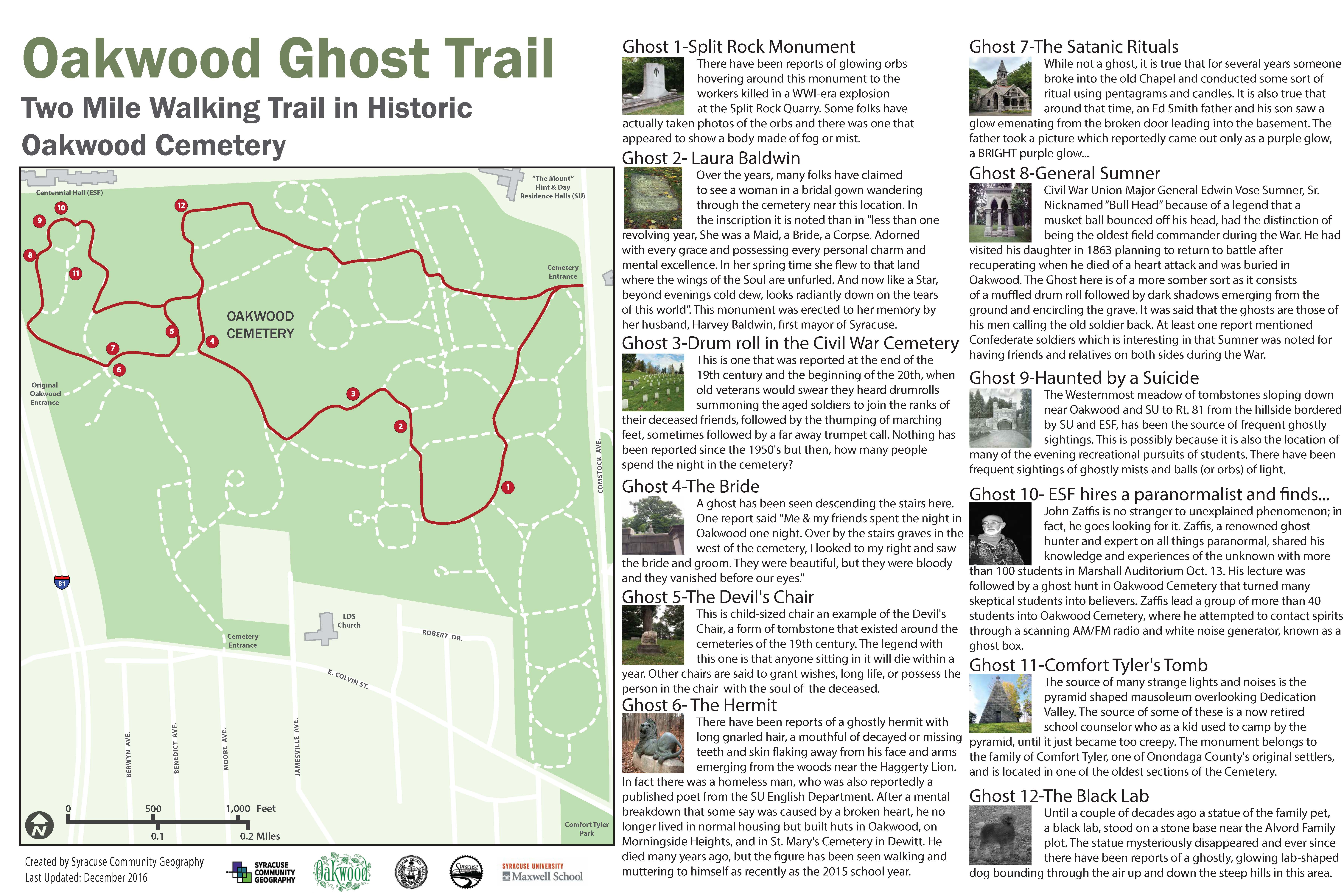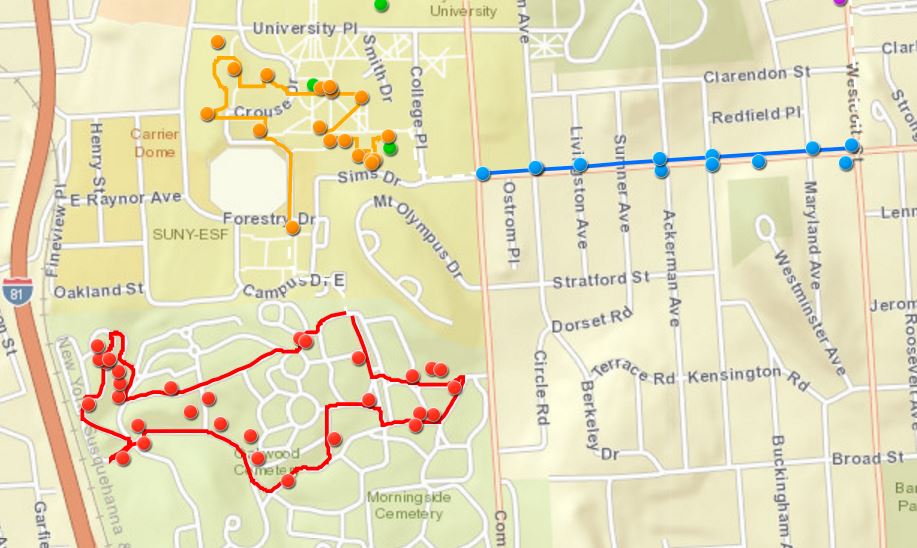 Syracuse Community Geography students worked with Paul Harvey, a local urban trail enthusiast and Creative Communities Facilitator, in the spring of 2015 to produce a trail map. Large versions of the trail map can be found displayed on kiosks at Barry Park and Ed Smith Elementary School. The Main Loop Trail connects Oakwood Cemetery, Morningside Park, Syracuse University, Ed Smith School and Barry Park.